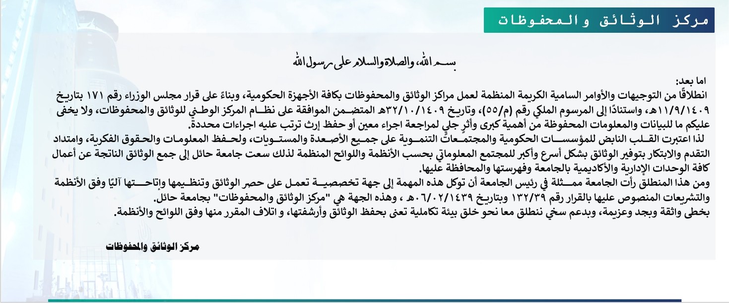 6. تنظيم أعمال حفظ الوثائق والمحفوظات بالجامعة بما يضمن المحافظة عليها وتصنيفها وفهرستها.