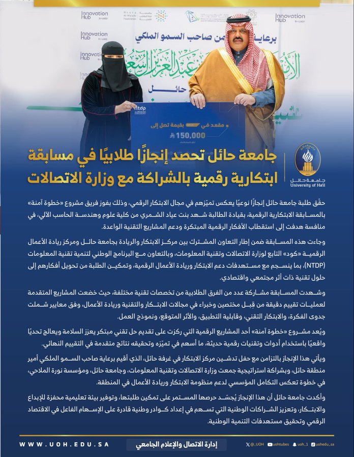 حققت طالبات جامعة حائل إنجازًا رياديًا بحصولهن على المركز الأول في المسابقة الابتكارية الرقمية، التي نظمها مركز ريادة الأعمال الرقمية (كود) التابع لوزارة الاتصالات وتقنية المعلومات، بالتعاون مع البرنامج الوطني لتنمية تقنية المعلومات (NTDP) وذلك بتاريخ 24/12/2025م الموافق 4 رجب 1447هـ.