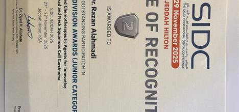 Razan Al-Ahmadi, a dental intern at the College of Dentistry, University of Ha’il, achieved a remarkable academic milestone by winning 2nd place (Junior Category) in the IADR Saudi Arabian Division Awards (IADR Hatton Award competition), during the Saudi International Dental Conference (SIDC 2025) held in Jeddah on 27–29 November 2025.
