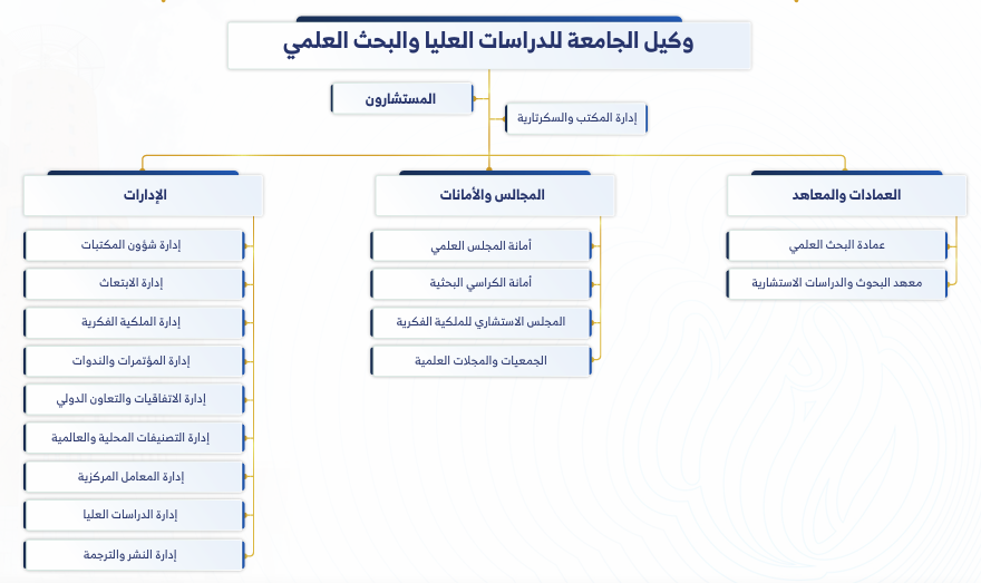 The University Agency for Graduate Studies and Scientific Research was established by Royal Decree on 30 Rabi’ al-Thani of 1426 AH, corresponding to June 7, 2005 AD. It assumes responsibility for developing graduate studies and scientific research at the university, as an integral part of the university and society system, and plays a fundamental role in achieving the university’s mission and achieving professional mastery and excellence in research skills among university staff, through developing scientific research and creating a stimulating environment for it. Activating postgraduate programs, overseeing specialized scientific conferences to enrich scientific research, communicating with experts in various scientific fields, and concluding numerous scientific agreements with distinguished scientific institutions both domestically and internationally, all contribute effectively to building a knowledge society. To achieve its goals and mission, the agency supervises the Deanship of Scientific Research, the Institute of Research and Consulting Studies, and the Department of Library Affairs.